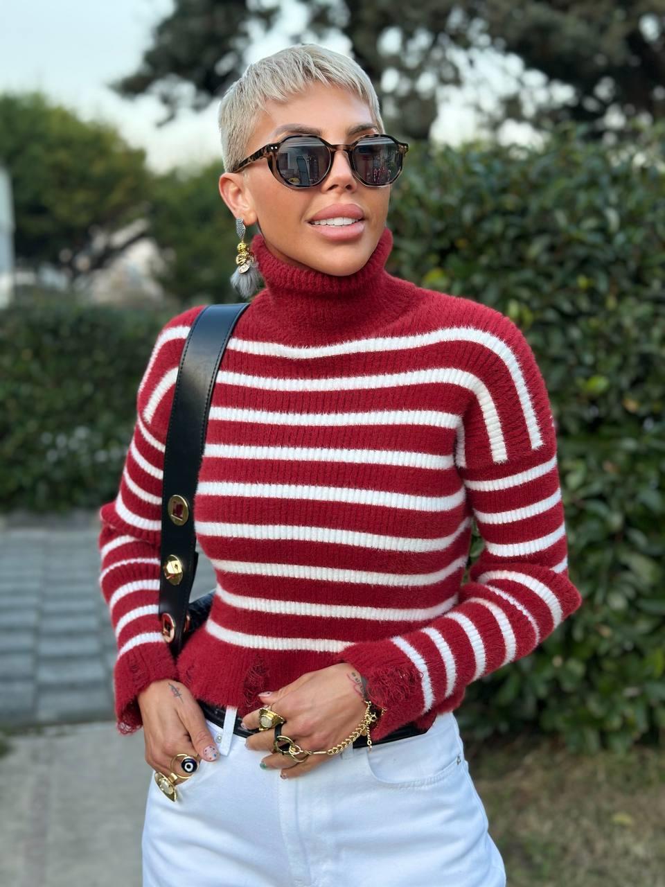BORDO-EKRU ÇİZGİLİ SAKALLI BALIKÇI YAKA KAZAK