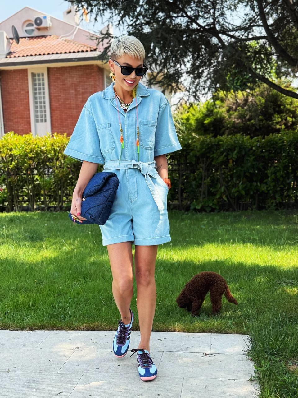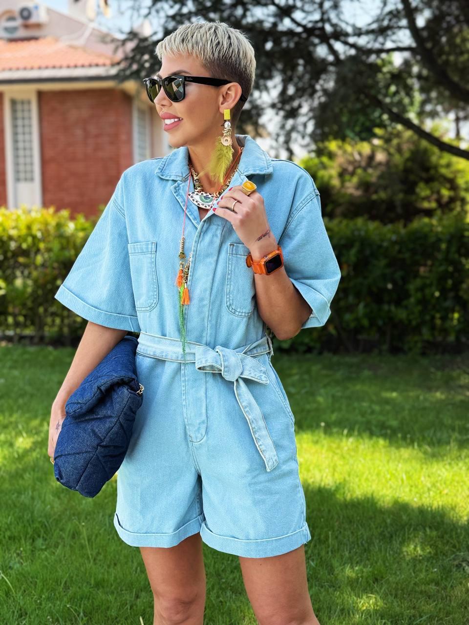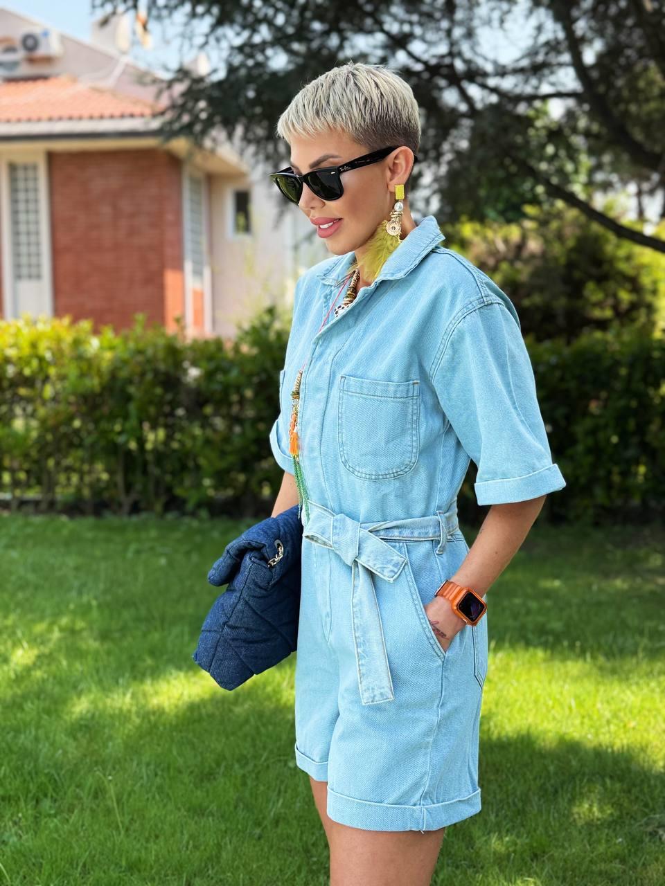 Günlük şıklık ve rahatlığı bir araya getiren bu tulum günlük hayatta, tatillerde ya da haftasonu gezilerinde kurtarıcınız olacak. Jean kumaş, önden düğmeli, kısa kollu, beli kuşaklı şort tulum modelindedir.