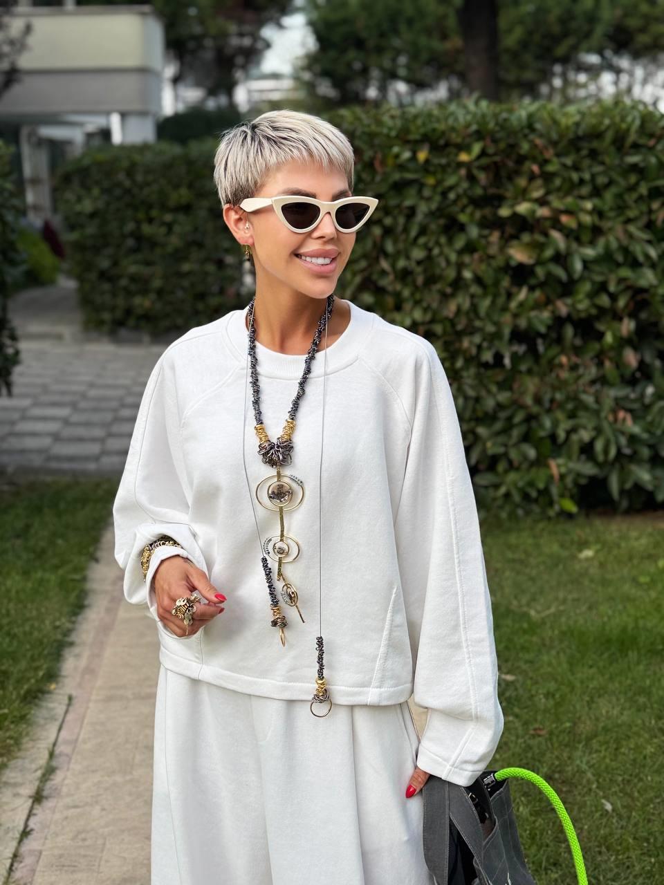 BEYAZ RİBANA YAKA PENS DETAY SWEATSHIRT