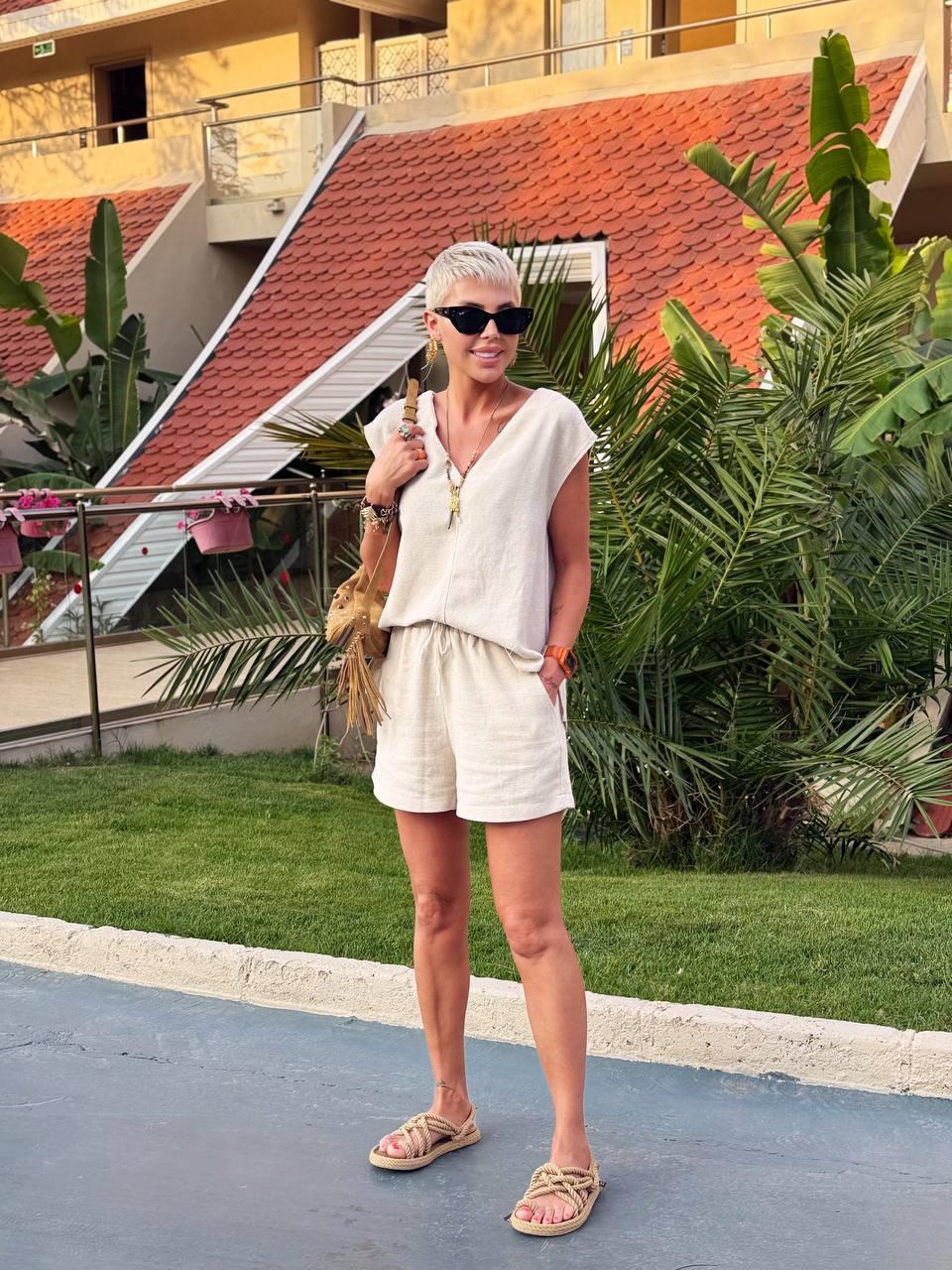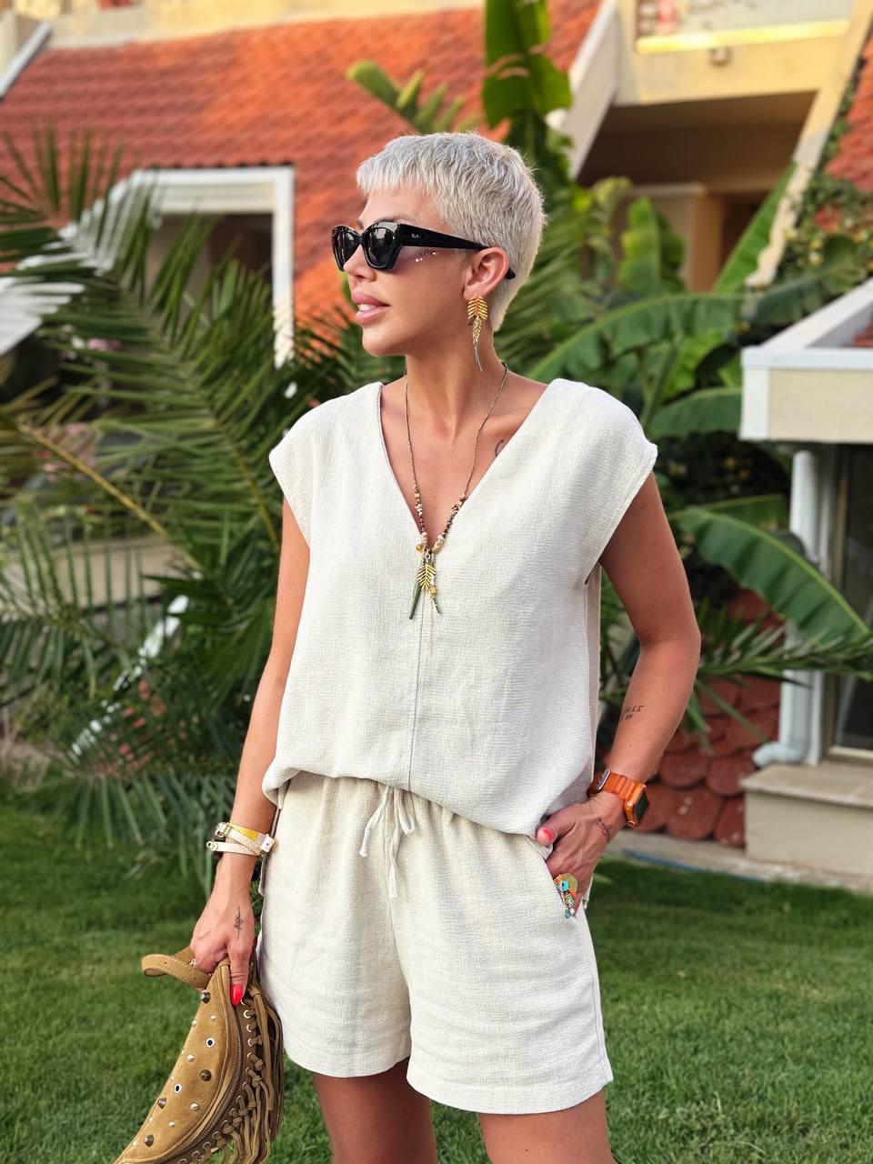 NATURAL RENK HAM KETEN BLUZ ŞORT TAKIM