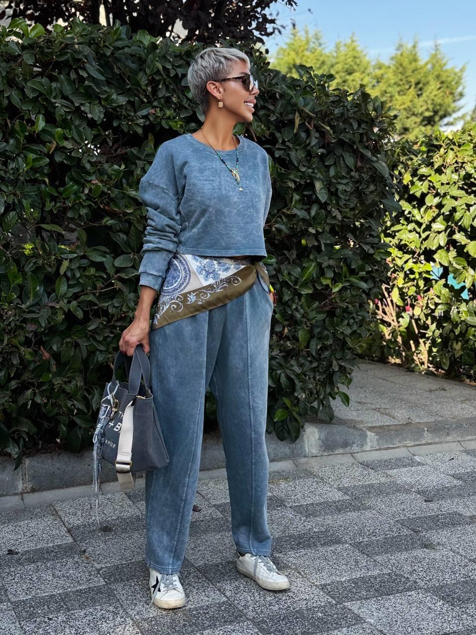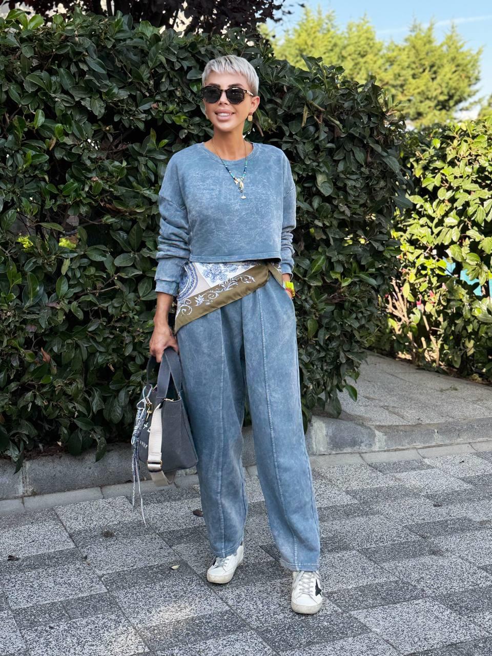 Gri eskitme görünümlü crop sweatshirt & şalvar pantolon takımı ile gün boyu rahat ve şık ol! Yumuşak dokusu ve oversize kalıbıyla modern, konforlu bir stil yakala.