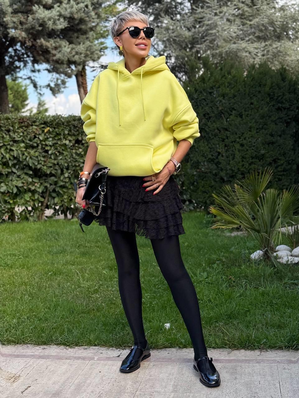 Bu etek, çok yönlü kullanımıyla gardırobun değerli bir parçası. Kat kat dantel dokulu üst yüzeyi, estetik bir görünüm sunarken, içinde şort astarı sayesinde hiçbir transparanlık sorunu oluşturmaz. Bel kısmı lastikli yapıda tasarlanmış; vücuda nazikçe oturur ve gün boyu rahatlık sağlar. Cep detayı yer almaz; sade ve duru bir yüzey korunmuştur. Tok ve hafif parlak dantel kumaşı, hem gündüz aktif kullanım için hem de özel davetler için uygun bir seçimdir.