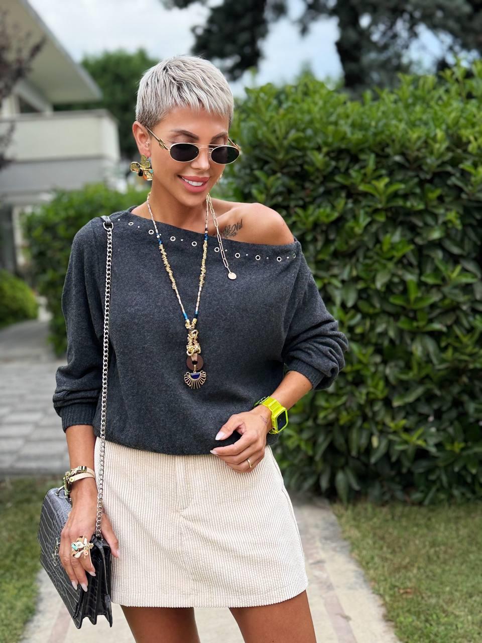 Modern şıklığın iddialı antrasit kazak, kayık yaka formu ve kuş gözü metal detaylarıyla dikkat çekiyor.