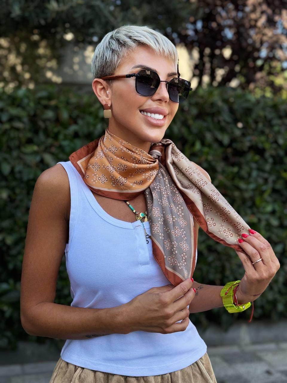 Kumaş: Yumuşak ve akışkan ipek-saten karışımlı kumaş Renk: Kahve zemin üzerine floral desen Form: Kare kesim Detay: Modern desenler
