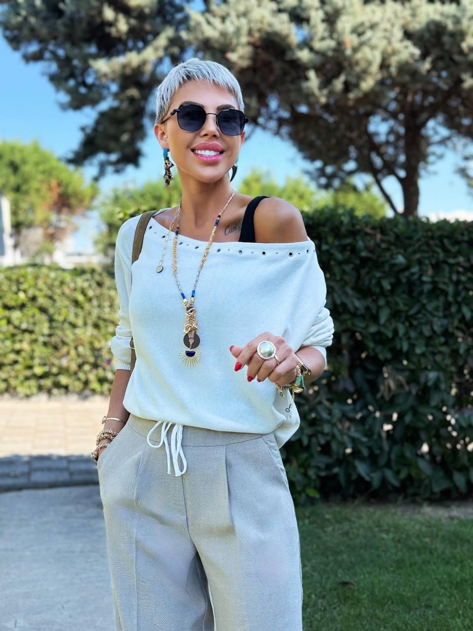 Modern şıklığın iddialı antrasit kazak, kayık yaka formu ve kuş gözü metal detaylarıyla dikkat çekiyor.