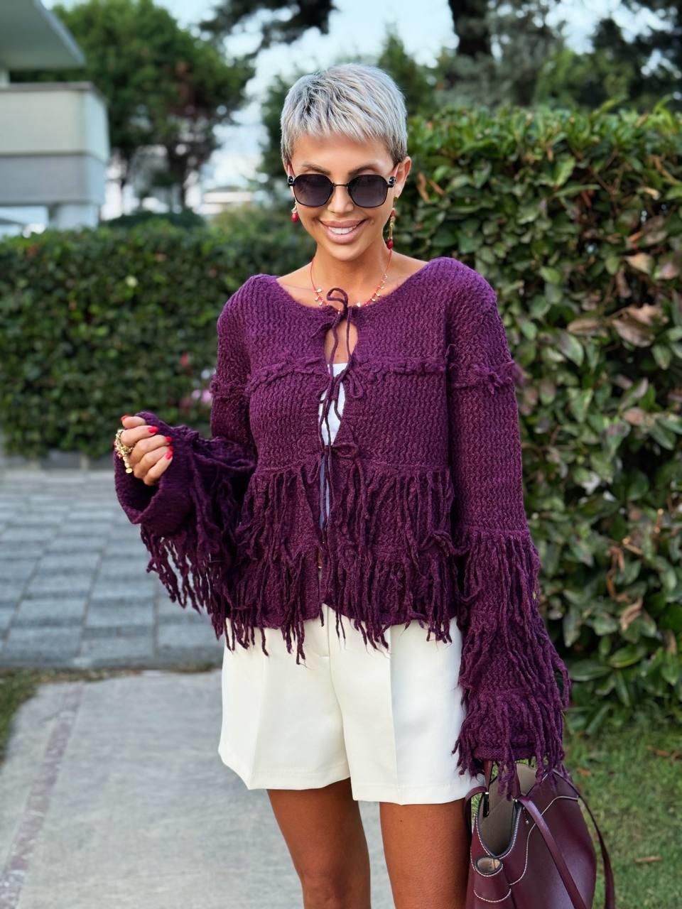 Mürdüm püsküllü triko hırka, salaş kesimi ve püskül detaylı.