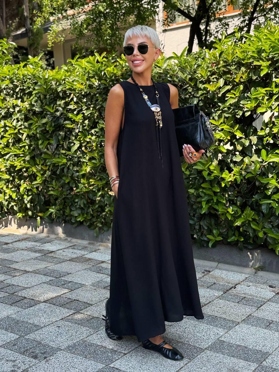 Kolsuz ve sırt dekolteli tasarımıyla sade ama dikkat çekici bir siluet sunan bu siyah elbise, minimal çizgilerle güçlü bir stil ifadesi yaratıyor. Hafif ve nefes alan dokusuyla her ortamda kendinden emin bir duruş sergiler.