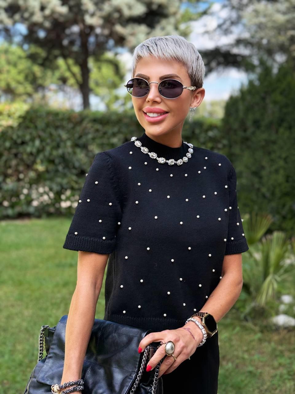 Detaylar: Yaka kenarları taş detaylarıyla dikilmiş, triko üzerinde inciler mevcut.